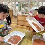 2022年11月30日 / 最終更新日 : 2022年11月30日 石坂和 園のブログ かきもいろいろ どんぐりみたいな形の柿に「これ、かき?」 園庭の柿とちがう形に興味津々。さて、味のちがいはわかるかな? どんぐりみたいな形。ヘタを残すのはなぜかな? 吊るして干すには、ここにヘタを通して~ 干したら「甘くなる」ってほんとう? くるくる回すととれるって 園庭の柿は四角くて、タネがあっても甘かったね