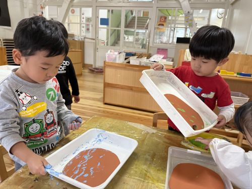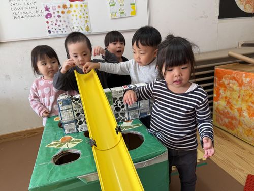 2025年11月14日 / 最終更新日 : 2025年11月14日 石坂和 園のブログ どんぐり遊び 絵本”どんぐりころちゃん”から様々な遊びをしました。模様付けでは、好きな色を決めてトレーを両手でしっかり持ってコロコロ。どんぐりクッキーではお水の量を加減したり、どんぐり転がしではスピード、音を楽しみました。 かたむけてコロコロ 「おみず、このくらいかな?」 「はやいねー!」