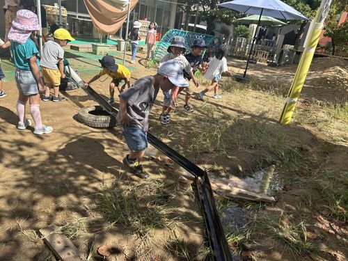 園庭に出て早速バッタを見つけたり、樋をつなげて水と一緒に葉っぱやエノコログサを流したり。