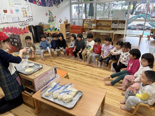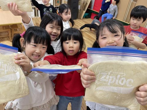 今年初の試みはうどんをみんなで作りました。作り方の絵本をみて材料を混ぜ、ふみふみしたうどんネタを一晩寝かして、最終日に年越しうどんでモリモリ頂きました。