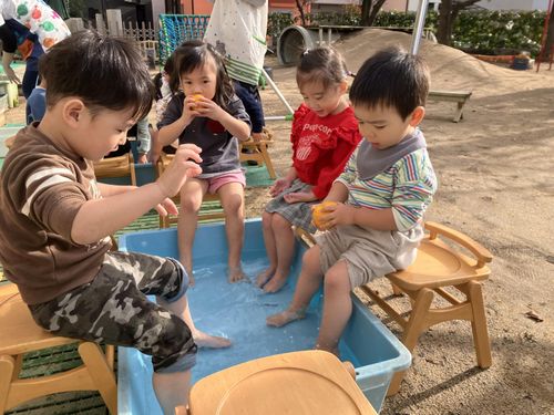 冬至の日、寒い中でも元気な子どもたち。ゆずの足湯でほっこり、園内がとってもいい香り。