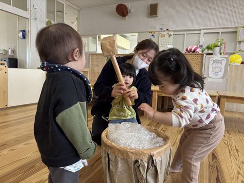 0.1歳も餅つきに挑戦?福笑い、かるた取り、こま回し、凧揚げ、羽子板にもチャレンジ。