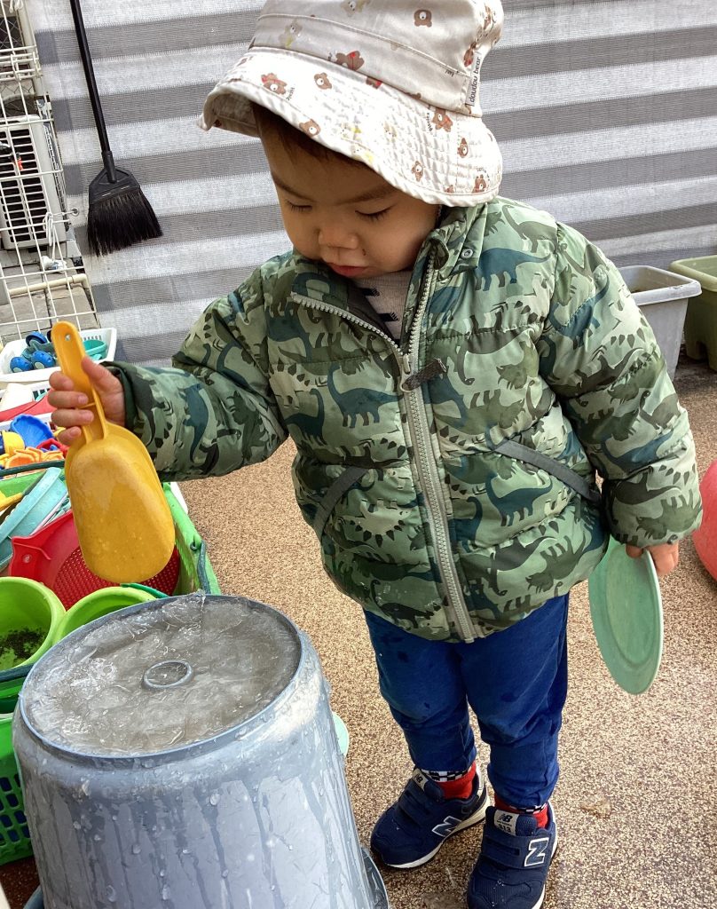 最強寒波到来と言われた日、登園するとテラス一面が白くなっていることに気づき大興奮の子どもたち。